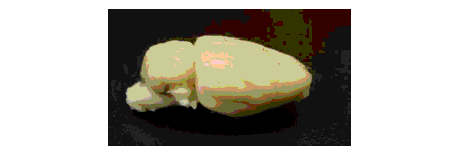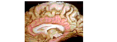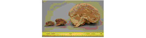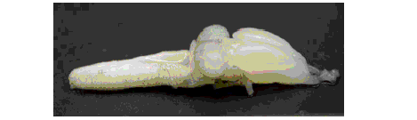 This brain of a frog (~2 cm. in length, weighing less than a gram), is an example of the sort of brain from which our internal derivative of a reptilian brain has evolved. We can actually remain alive if most of our brain on top of this older portion is completely damaged or removed, but we lose all human qualities of thought and emotion - literally becoming a human vegetable with the clinical description of `brain dead.'