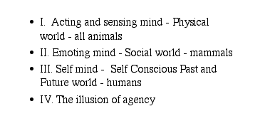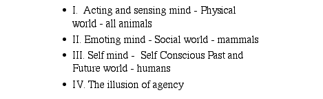 IV., our "I" illusion, the illusion of agency or conscious will.