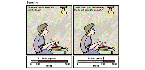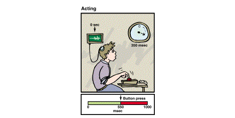 to a light coming on. The button push occurs about 200 msec after the light comes